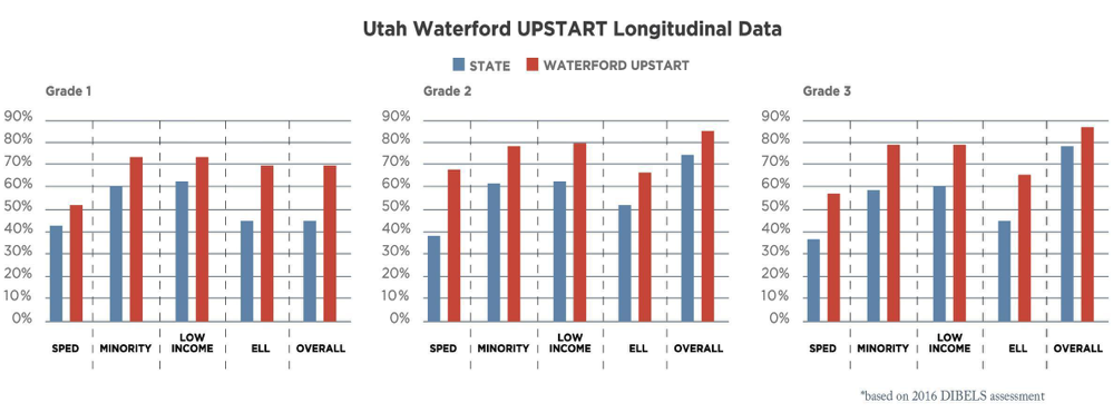 - Waterford UPSTART improves child outcomes. Research and multiple independent evaluations show that children who graduate from Waterford UPSTART outperform their peers in foundational literacy skills with improved outcomes persisting over time.