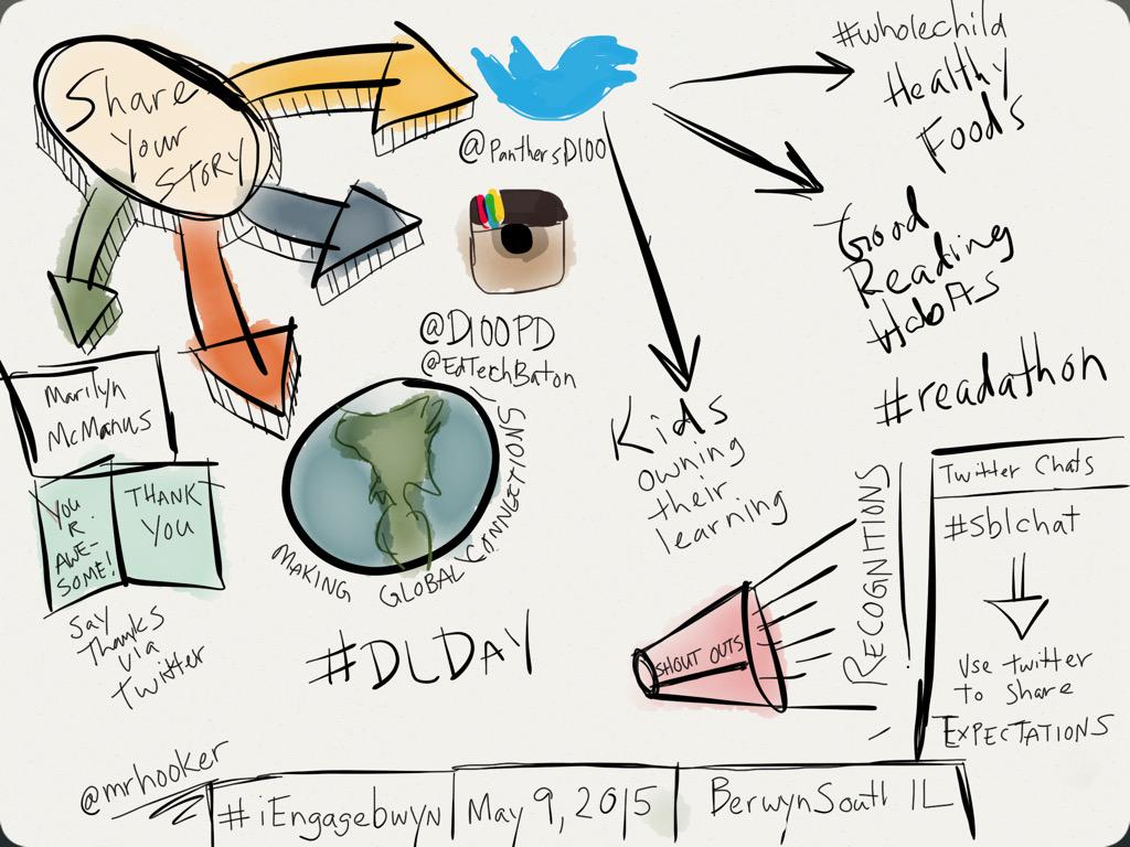 Saturday morning keynote speaker John Antonetti said it best when he said, “Engaging without cognition is really just having fun without achieving anything.” The technology usage during the two days was engaging, but also extremely meaningful and encouraged learning. From the APPmazing Race to the outstanding sessions shared by teachers, leaders, and students, learning was interactive and it was everywhere. Closing keynote speaker Kevin Honeycutt‘s always entertaining and poignant words were the perfect wrap-up for this event. One of my favorite sessions was by Pershing Principal Marilyn McManus and all the ways she uses social media like Twitter and Instagram to share the story of their school. As a leader, I found it inspiring to see someone modeling the very things she wants her students and staff to do. Here’s a sketchnote of that session: